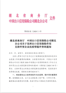 湖北省商务厅、中国信保湖北分公司联合印发《关于发挥出口信用保险作用支持外贸企业抗疫情稳外贸的通知》