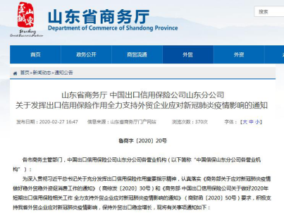山东省商务厅、中国信保山东分公司联合印发《关于发挥出口信用保险作用 全力支持外贸企业应对新冠肺炎疫情影响的通知》
