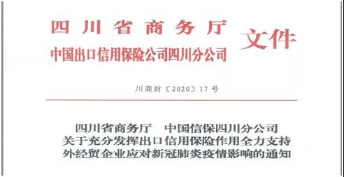 四川省商务厅、中国信保四川分公司联合印发《关于充分发挥出口信用保险作用全力支持外经贸企业应对新冠肺炎疫情影响的通知》