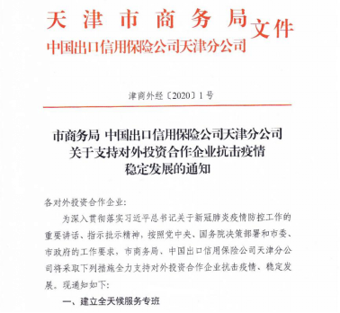 天津市商务局、中国信保天津分公司联合印发《关于支持对外投资合作企业抗击疫情稳定发展的通知》