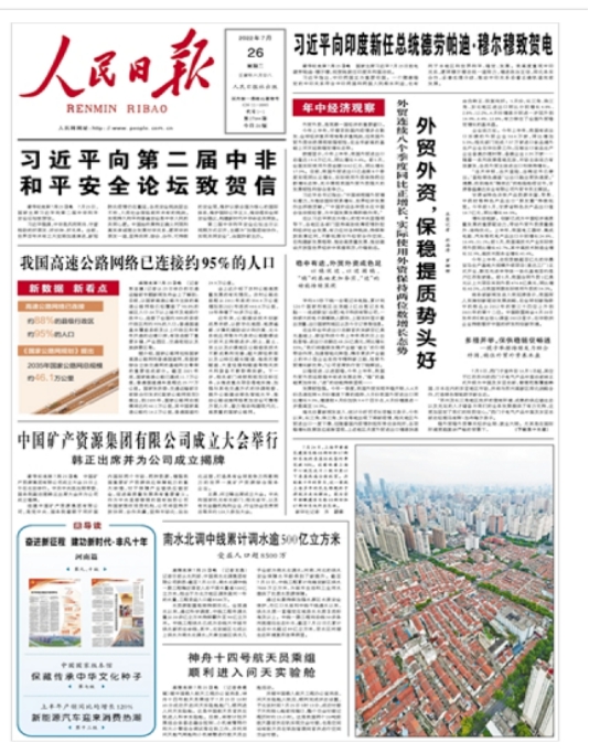 7月26日,《人民日报》头版发表“年中经济观察”系列专题文章之《外贸外资,保稳提质势头好》。文章在“多措并举,保供稳链促畅通”段落中专门提到公司保障产业链供应链畅通稳定的案例和成效,肯定了公司充分发挥出口信用保险服务保障积极作用,展现了公司作为政策性机构认真贯彻落实习近平总书记关于出口信用保险工作的重要指示精神,努力促进外贸稳中提质的作为与担当。以下是详细报道和截图: