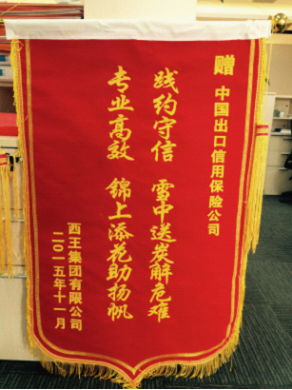 为保障企业正常经营,中国信保依据保险合同就企业的损失进行了足额的赔偿,赔款金额高达1000多万美元。从企业通知风险发生到获得赔款仅用了不到2个月的时间。西王国际贸易有限公司总经理马本强说:“这个案子我们有两个没想到:一是没想到市场风险这么大,我们做国际贸易这么多年,真的没想到这么大金额的即期信用证,开证行能够违反国际惯例擅自违约;二是没想到这么大的案件中国信保能够在这么快的时间内支付赔款。说句实在话,这个案子之所以能有今天这么圆满的结果,是中国信保的专业给我们企业创造的价值。”西王集团副总经理王红雨更是感概万分:“此次企业面临巨额损失,中国信保雪中送炭,不愧是为外贸企业排忧解难的好帮手。