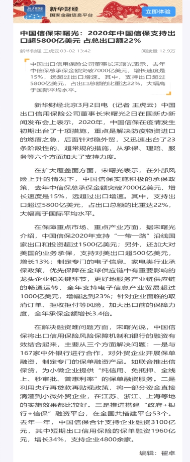 新华社:中国信保宋曙光:2020年中国信保支持出口超5800亿美元 占总出口额22%