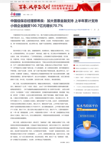 中国网:中国信保总经理蔡希良:加大普惠金融支持 上半年累计支持小微企业融资100.7亿元增长70.7%