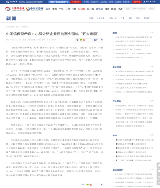 《上海证券报》:中国信保蔡希良:小微外贸企业目前至少面临“五大难题”