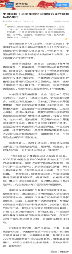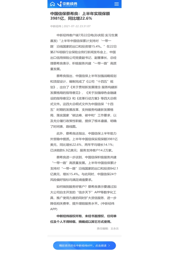 中新经纬:中国信保蔡希良:上半年实现保额3981亿,同比增22.6%