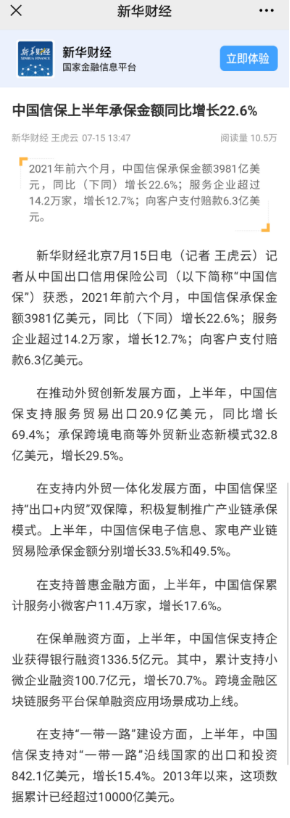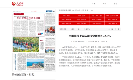 《人民日报》海外版:中国信保上半年承保金额增长22.6%
