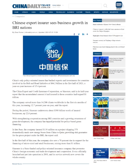 CHINA DAILY》:Chinese export insurer sees business growth in BRI nations