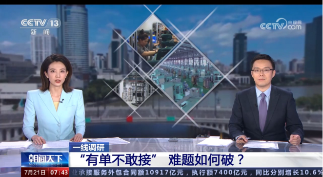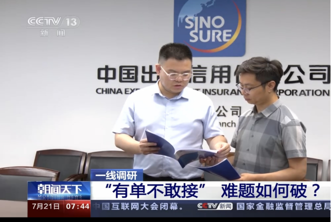 7月21日,中央广播电视总台央视新闻频道《朝闻天下》播出“一线调研 :‘有单不敢接’ 难题如何破?”新闻报道,在中国信保的支持配合下,中央广播电视总台央视新闻频道记者赴中国信保宁波分公司和企业一线实地采访,重点以中国信保承保的内贸险业务为案例,就支持企业内外贸一体化发展情况专访中国信保宁波分公司主要负责人、南三县业务处负责人,以及相关企业负责人,反映了中国信保加强政策性出口信用保险和国内贸易信用保险协同支持内外贸一体化,推动内外贸高效运行、融合发展的举措和成效。以下是报道的主要内容和视频截图: