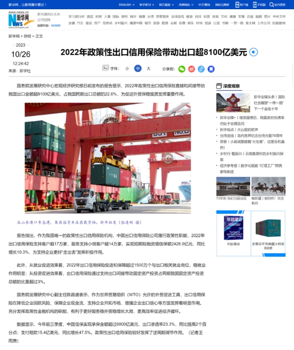10月24日,国务院发展研究中心在京发布《中国出口信用保险公司政策性职能履行评估报告(2022年度)》。人民日报、新华社、经济日报等多家中央媒体到场采访。截至目前,《人民日报(海外版)》、新华社、《经济日报》、《金融时报》、《国际商报》、《中国银行保险报》、新华网和中国网等261家新闻媒体报道和转载了中国信保履行政策性职能,充分发挥逆周期调节作用,助力稳外贸稳经济大盘、高质量服务共建“一带一路”、大力发展普惠金融、助力绿色金融发展等方面的主要情况,肯定了中国信保2022年坚决贯彻落实习近平总书记关于充分发挥出口信用保险作用的重要指示,按照党中央、国务院决策部署,切实履行政策性职能,努力走好中国特色出口信用保险发展之路,为推进中国式现代化贡献的信保力量。截至发稿时,新闻媒体仍在持续报道中。以下是部分媒体的详细报道和截图: