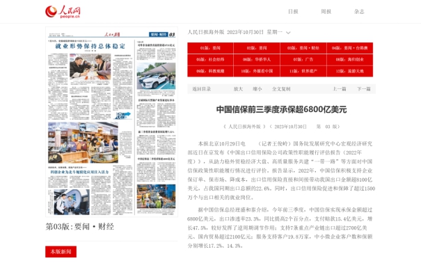 《人民日报海外版》:中国信保前三季度承保超6800亿美元