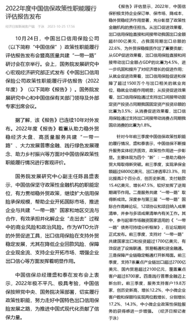 《经济日报》:2022年度中国信保政策性职能履行评估报告发布
